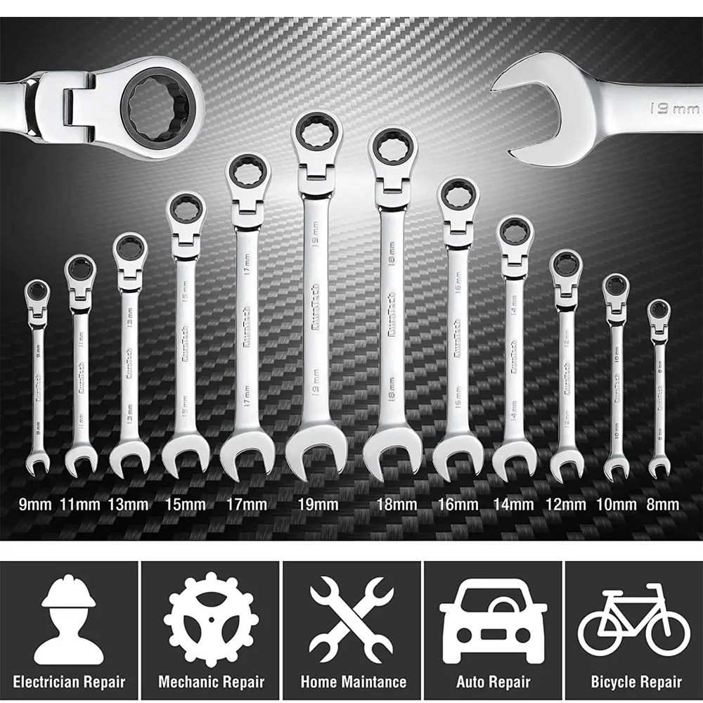 This flexible head ratchet wrench set is built for speed and precision. Whether you're working on cars, machinery, or home projects, the ergonomic design and Cr-V steel construction ensure reliable performance even under heavy use.